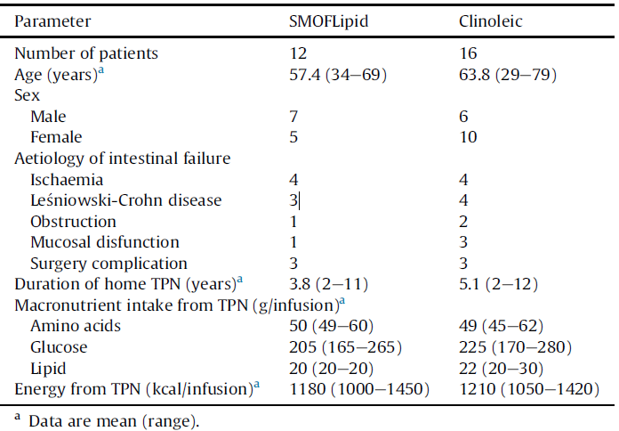 Tablo 1, bu hastaların özelliklerini ve beslenme desteklerinin genel içeriklerini göstermektedir. Hastalar, her gün 16 ila 18 saat boyunca infüze edilen yaklaşık 20 g lipit aldı.