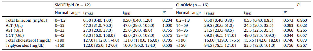 Veriler sadece hem tSTART (başlangıç) hem de tEND (sonuç) örnekleri mevcut olduğunda kullanıldı: tEND örnekleri SMOFLipid grubundaki bir hasta için ve ClinOleic grubundaki üç hasta için mevcut değildi. Bu sebeple, iki gruptaki örneklem büyüklüğü sırasıyla 12 ve 16 idi.