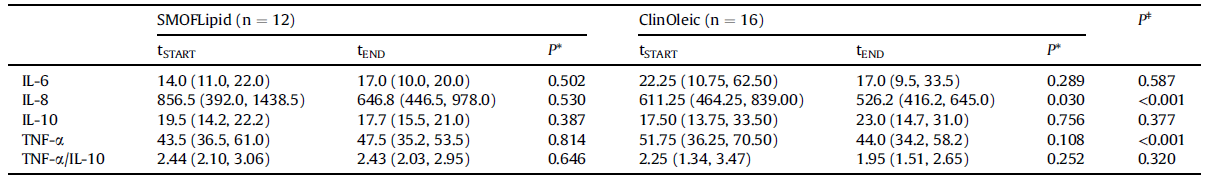 IL-1 β, IL-12 ve IFN- γ konsantrasyonları, plazma örneklerinin çoğunda tespit sınırının altındaydı. Buna karşılık, IL-6, IL 8, IL10 ve TNF- α, bütün numunelerde kolayca tespit edildi ve bu dört sitokin konsantrasyonları, Tablo 4’te rapor edildi. TNF- α’nın IL-10’a oranı da (Tablo 4) bir “enflamatuar indeks” olarak rapor edilir, çünkü TNF-α pro-enflamatuardır ve IL-10 anti-enflamatuardır ve ikisi birbirinin hareketlerine antagonist hareket eder. IL-6, IL-10 ve TNF- α konsantrasyonları ve TNF- α’nın IL-10’a oranı, SMOFLipid veya ClinOleic’e transfer olmuş olunsa da değişmedi (Tablo 4). Hastalar 60 gün boyunca ClinOleic aldıklarında IL-8 konsantrasyonu azaldı ve bu durumda konsantrasyon SMOFLipid grubundan daha da düşük oldu (Tablo 4).