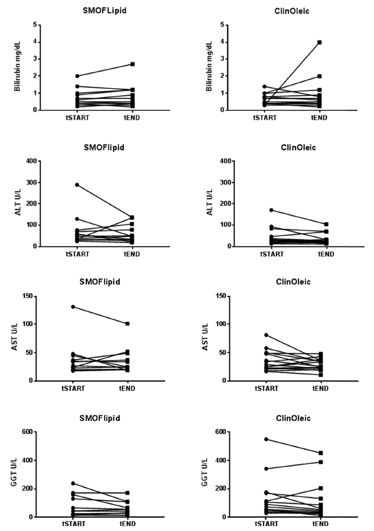 Ne total bilirubin ne de ölçülen üç karaciğer enzimi (ALT, AST, GGT), hastaların 60 gün boyunca Intralipid’den SMOFLipid’e transferi ile değişmedi (Tablo 2). Total bilirubin, hastaların Intralipid’den ClinOleic’e geçmesiyle de değişmedi (Tablo 2). Bununla birlikte, GGT konsantrasyonu 60 günlük ClinOleic kullanımı sonrasında öncekine göre anlamlı şekilde daha düşüktü (P=0.044; Tablo 2) ve hem ALT hem de AST konsantrasyonları 60 günlük ClinOleic’ten sonra düşme eğilimindeydi (sırasıyla P = 0.093 ve 0.066 ; Tablo 2).