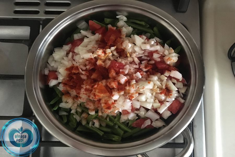 - Soğan ve sarımsak ve domatesler küp küp doğranır, taze fasulyenin üzerine ilave edilir.